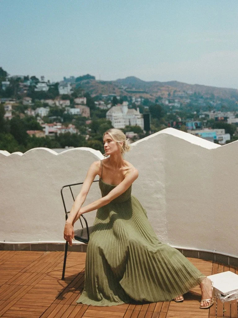 Imagine yourself confidently walking into a room, every detail of your dress moving with a graceful rhythm. The soft pleats, the refined fit, and the deep olive green color give you an aura that is both powerful and feminine. With VERONIQUE VERDE™, you feel stylish, chic, and completely yourself.